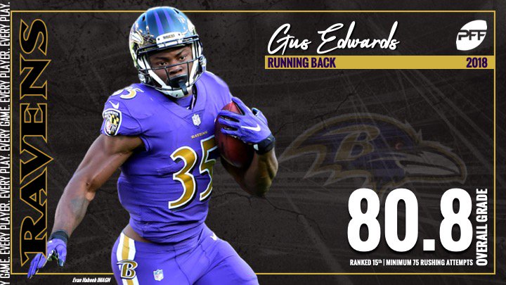 Ravens Gus Edwards. He ranked fifth in the NFL with 52 yards per carry as a. Since the start of 2018 Edwards ranks fifth in PFF rushing grade 902 and yards per attempt 51.
